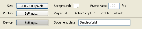 In our simple world, the only class is the document class. In Flash 9 ( I use the Flash CS3 tool here ) one of the properties of the document is the document class, which we set in the property inspector. We no longer have to write any first frame actions.
